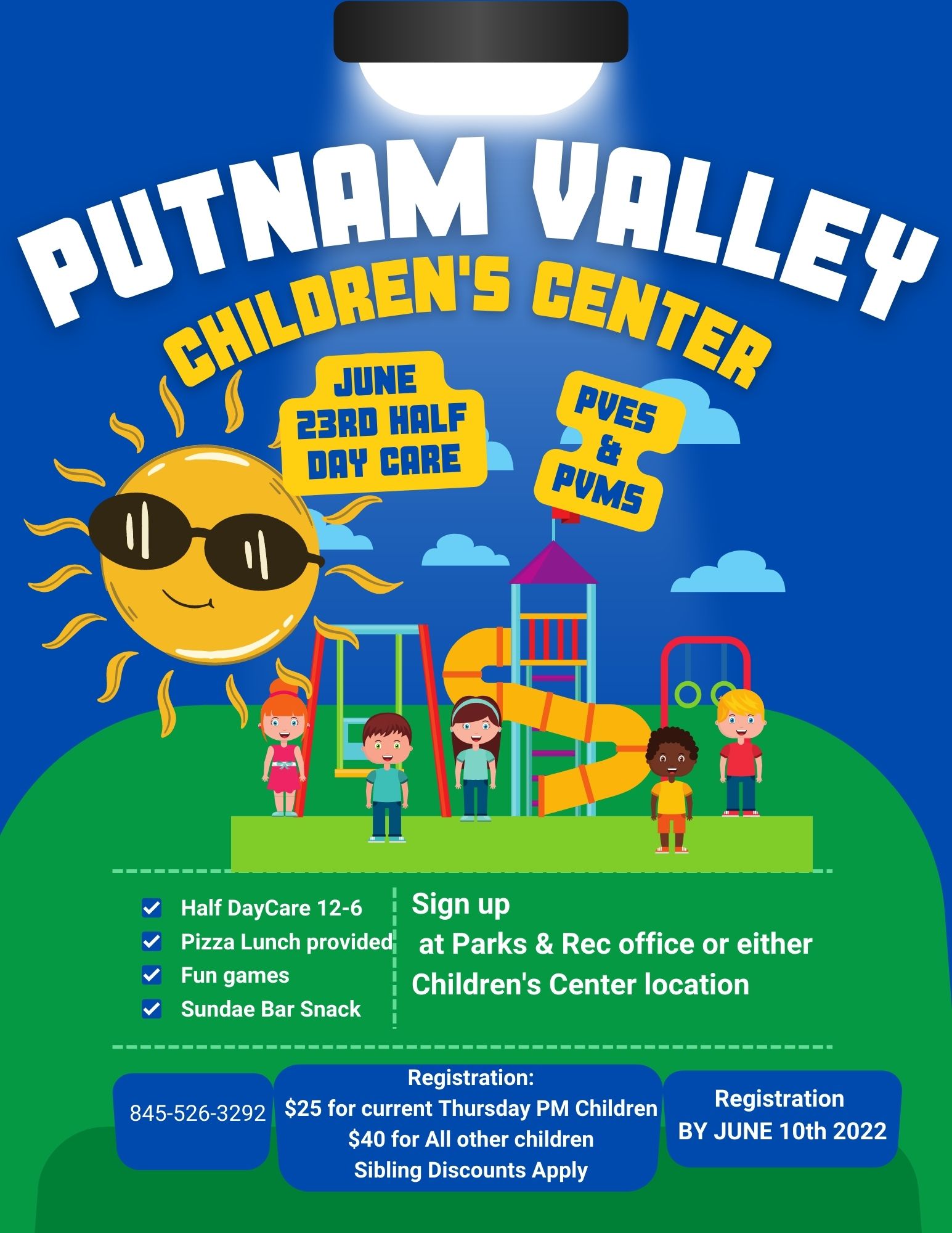 Just to clarify we are NOT having an on-line sign up for the June 23rd Half Day Care due to the last minute change in the school calendar. All sign ups are in person at Parks and Recreation, at the children's centers or over the phone at Parks and Rereation.