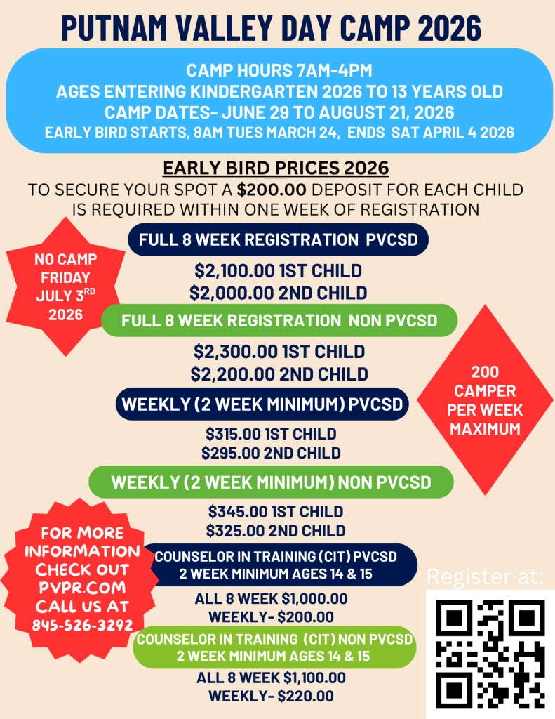 ***While you are anxiously waiting for the registration start date you can do a few things to prepare for the big day. Go into your account: https://reg.pvpr.com making sure you know your login information of user name and password. Once you are in the account, please edit your child’s enrollment by changing their grade, making sure it is updated to be what they will be entering into for September 2026. This will ensure they are placed in the appropriate group for the summer. Please update your child’s t-shirt size as that is what will be ordered for your child and cannot be changed once supplies arrive. Review all phone numbers, emergency contacts and email addresses. If you need any assistance in resetting your password or forgot your user’s name, please call us at Parks and Recreation, 845-526-3292, PRIOR to registration so we can assist you.